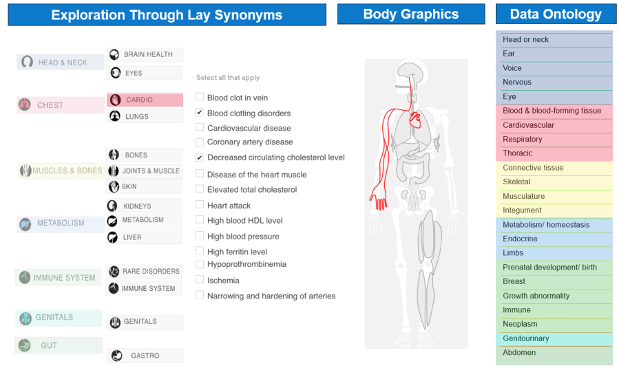 Since the introduction of precision medicine, health consumers are increasingly needing to interact with digital interfaces to report their health data. This creates new challenges for the design of interactive systems: 1) the symptoms of an illness can often be located to an activity or a body part and untrained patients struggle to communicate them clearly, and 2) Health consumers and data analysts rarely communicate with each other about their data needs and concerns. To address these issues, I conducted a study in ethnomethods in a precision medicine company to understand the data requirements of health analysts (N=5). This exploration led to one methodological recommendation for short-term ethnography for VA, and four design guidelines that translated into a data capture system that visually maps a clinical data ontology to a graphical depiction of the body. My system is rooted on the human phenotype ontology to support health care workers to provide more accurate analyses and find new correlations, aid caregivers in managing health risks and empower patients to take action to better their health. The somatic representation was tested on lay users (N=8), and the results show that the representation allowed patients to have a more accurate and descriptive understanding of their illness experiences, and by doing so it captured more reliable data. While my system captured fewer conditions (mean=5, SD=1.852) vs a simple, text-based form (mean=5.65, SD=1.922), it was shown to be more accurate since it captured fewer false positives (mean=1.625, SD=1.768) vs. (mean=5, SD=5.701).