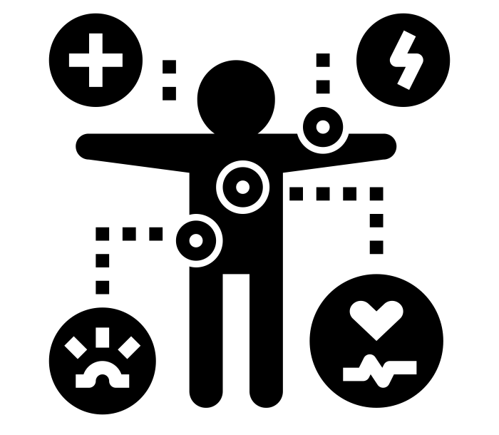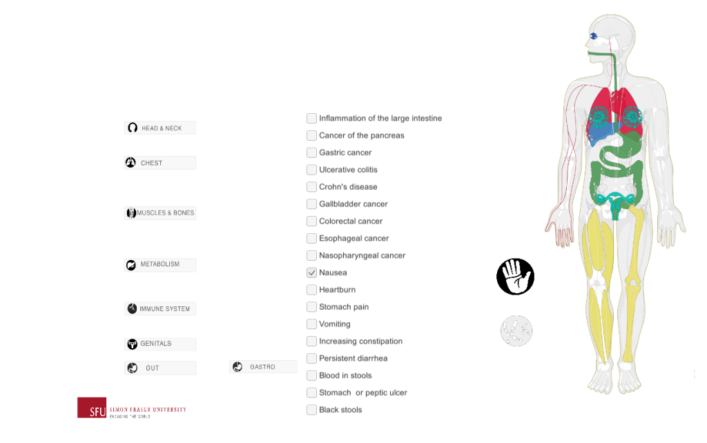 IV) Prototype: Interactive Scene where the users selects conditions. The visual feedback adds up when the user selects conditions from multiple body systems/categories.