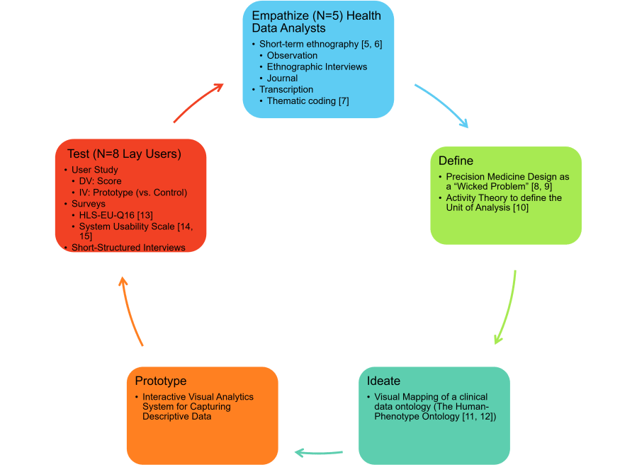 In popular culture, Stanfords 5-step DT [3] approach has seen a spread of the methodology and its implementations across different fields, yet this has also caused an oversimplification of the methodology and a lack of focus on the research component. In that sense, Nielsen Norman’s framework [4] is rooted in research which can scaffold methodologies and methods that can be applied to the design and evaluation of VA systems.